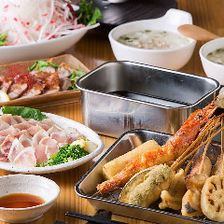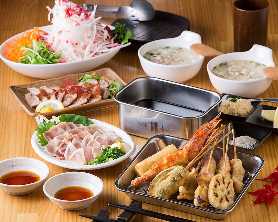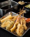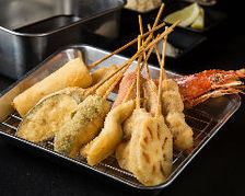 串揚げの発祥地は大阪の新世界だと言われています。 大正末期~昭和にかけて考えられた庶民派の料理で 、串かつは串揚げの中でも「ステンレスの容器にいれたオリジナルソース」に串をくぐらせて食べる、二度づけ禁止!のスタイルです。当店では、関西の串かつに魅了された大将が、衣にこだわりぬきました。